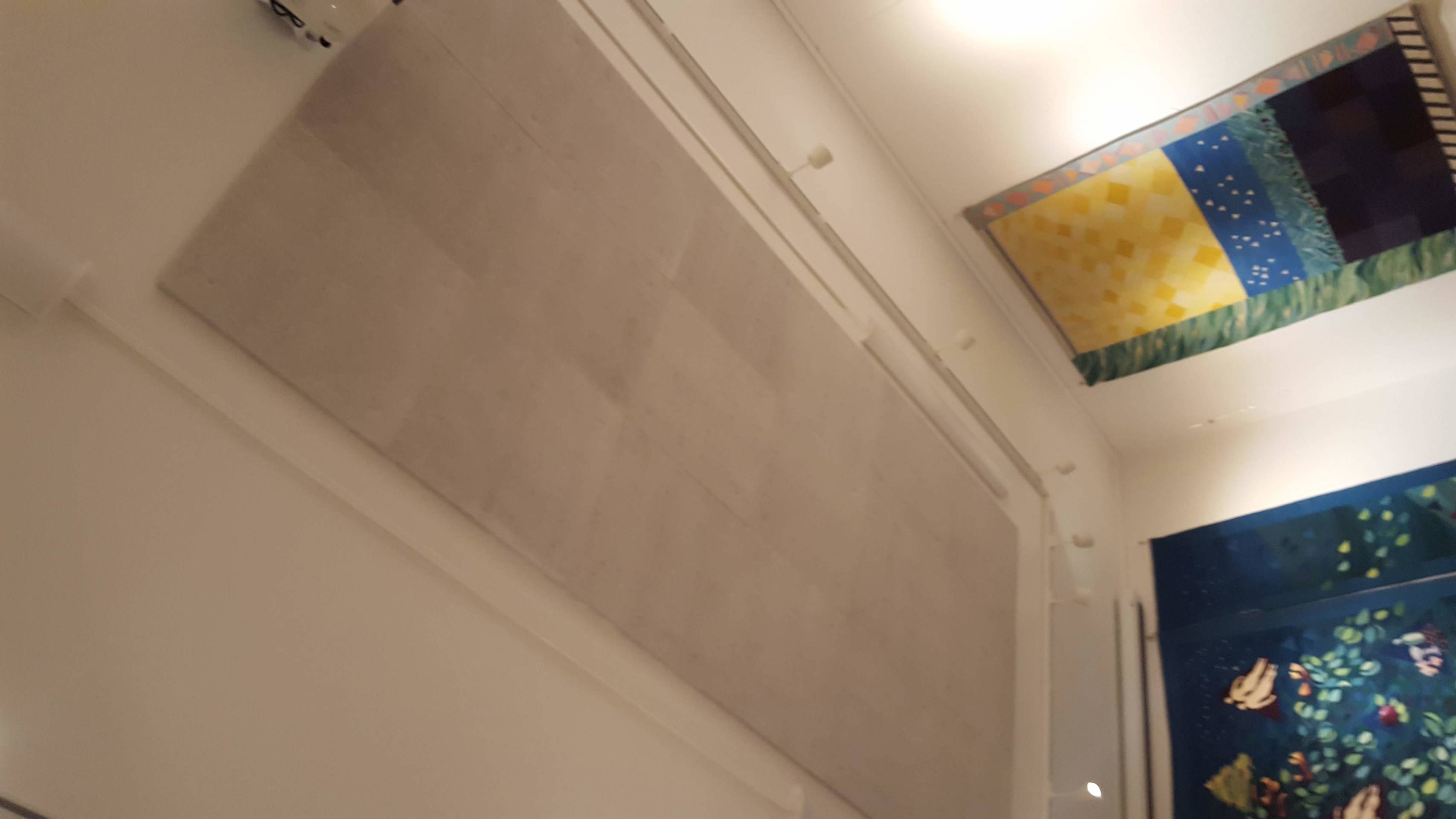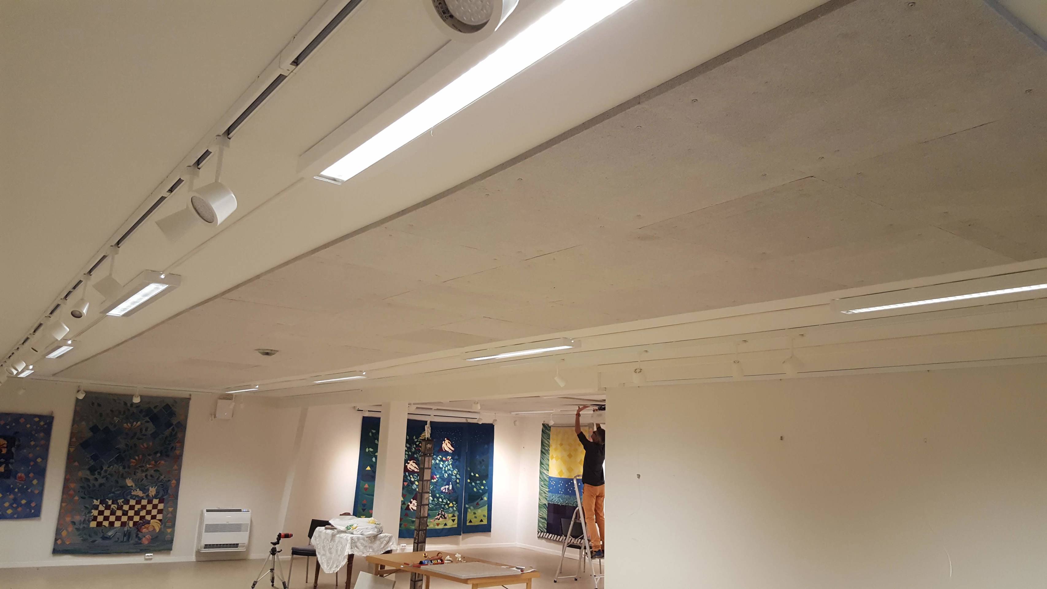 Montering av lyddempende plater i taket for å få ned akustikken.